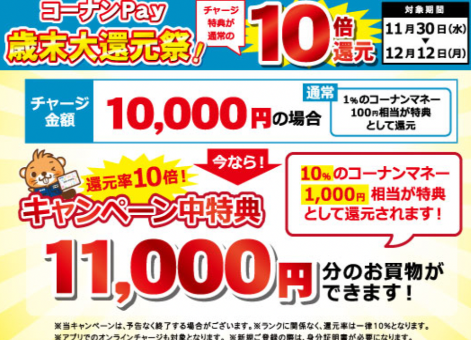 コーナンペイの10倍キャンペーンとは、通常のチャージ還元率が大幅にアップする特別な期間のことです。このキャンペーン期間中は、通常1%のチャージ還元が10%になるため、10,000円のチャージごとに1,000円相当のポイントが付与されます。言ってしまえば、非常に大きな節約効果を生むチャンスです。